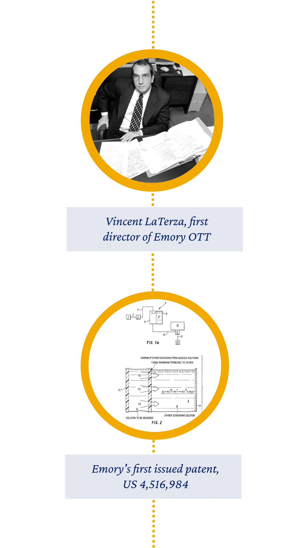 By 1985, Emory had earned its first U.S. patent — granted to Emory inventor Isiah Warner for a degassing process and apparatus for removal of oxygen. OTT also saw the formation of its first start-up company, CytRx (now LadRx), in 1986.
